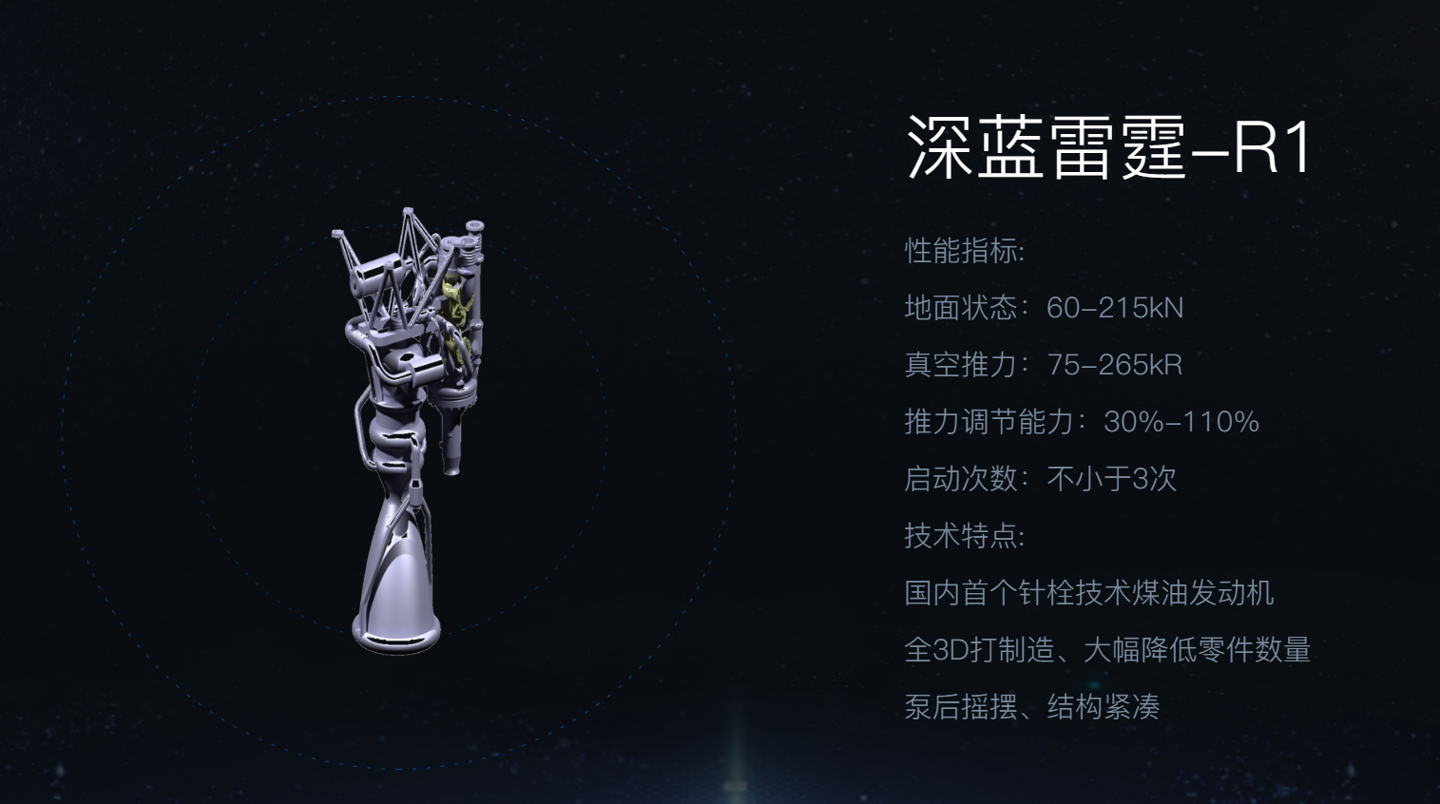 该火箭搭载的“雷霆-R1”液氧煤油发动机号称是“国内首个针栓技术煤油发动机”,真空推力达 75-265kR。该发动机 85% 重量为 3D 打印制造,采用泵后摇摆。