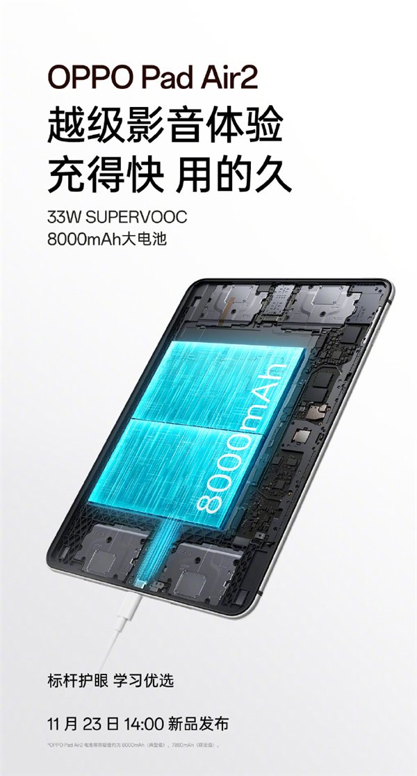 不仅如此,OPPO Pad Air2提供8GB+256GB存储版本,内置8000mAh大电池,支持33W有线快充。