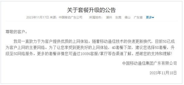 中国移动广东公司在公告中写道:“为了让您享受到更良好的上网体验,4G套餐下架,建议您选择5G套餐,升级至5G网络服务。”