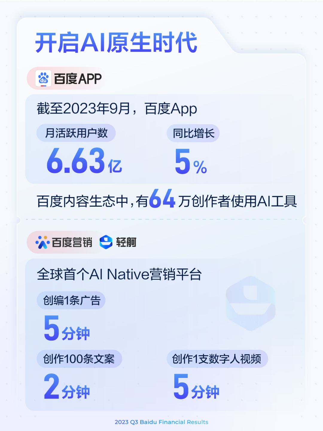 此前百度发布的全球首个AI Native营销平台“轻舸”等,依托于AI驱动营销创新,提高了企业的内容生产和广告投放效率,实现对广告系统的带动作用。