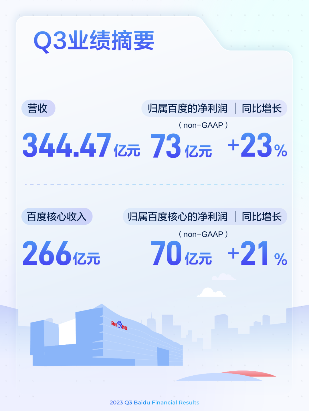 三季度,百度继续保持高质量业绩表现,总收入344亿元,归属于百度的净利润(non-GAAP)达73亿元。百度核心收入达266亿元,归属于百度核心的净利润(non-GAAP)达70亿元,同比增长21%。