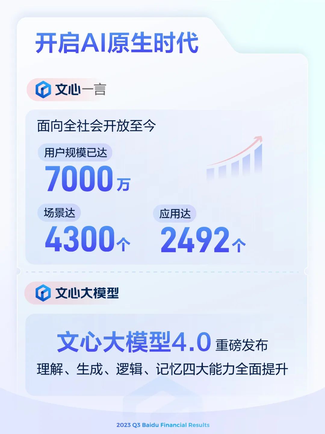 百度创始人、董事长兼首席执行官李彦宏表示:“在生成式AI和基础模型的新兴机遇背景下,百度不断强化技术、改进产品,特别是推出了文心大模型4.0,这是百度最强大的基础模型。我们还利用文心大模型和文心一言的能力,重构了消费级、企业级产品及自身运营,在带来AI原生体验的同时,不断提升效率。”
