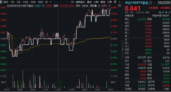 A股核心宽基中证100ETF基金(562000)跟踪中证100指数,场内价格收涨0.6%。场内交投活跃,全天成交4245万元,流动性在同标的ETF中表现最佳。