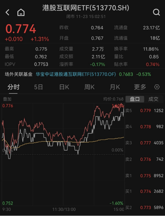 场内ETF方面,随着权重股集体拉升,港股互联网ETF(513770)午后直线上行,截至收盘场内价格收涨1.31%,成交额2.11亿元。