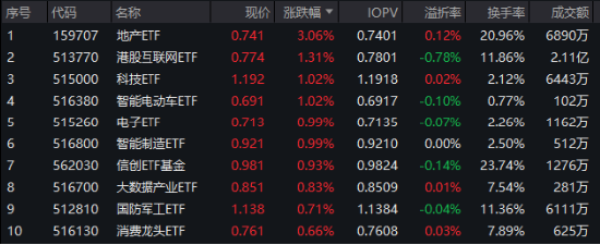 盘面上,受多重利好催化,地产板块全天表现亮眼,龙头房企集体大涨,表征A股龙头房企行情的地产ETF(159707)场内价格劲涨3%!泛科技股普遍回暖,在人工智能的带动下,Q3全球半导体行业总产值环比增长8.4%,半导体午后集体走强,科技、电子、智能制造、信创、大数据等相关ETF悉数上涨。