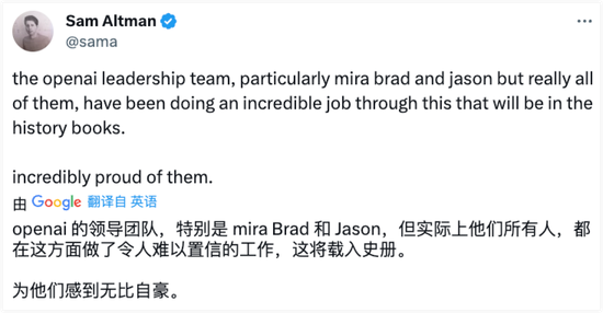 花絮13:Sam Altman对同事们的表现非常满意,并发推点名表扬了Mira Murati、Brad Lightcap(COO)和Jason Kwon。对Mira来说,这有些“赦免”的意味。