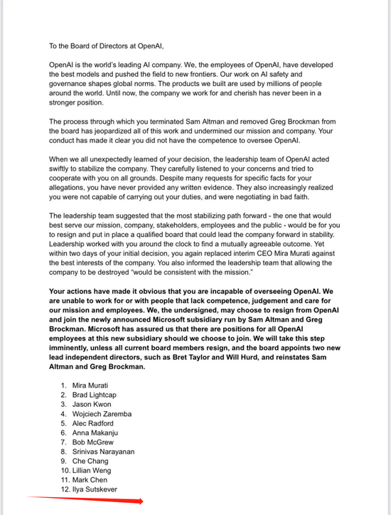 主线#15:在推上刷屏的同时,Mira姐姐内部发起了一封态度强硬的公开信,要求董事会辞职,以及Sam和Greg回归,否则将追随他们加入微软。