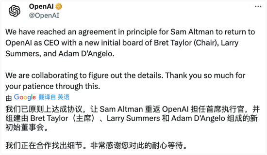 北京时间11月22日下午2:03分,OpenAI官方账号发布推文宣布阿尔特曼重任CEO,并且董事会大换血: