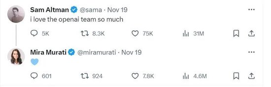 花絮6:11月18日上午,Sam Altman发帖强调自己非常喜欢OpenAI团队,理论上是敌人的Mira转发并奉上爱心,吃瓜群众感到一阵迷糊。
