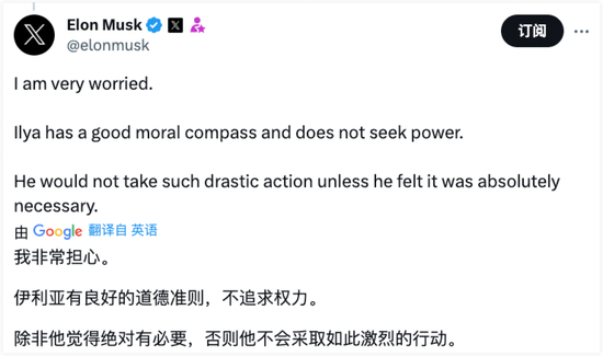 花絮5:似乎只有马斯克在暗暗支持政变,他发帖道:Ilya有着良好的道德准则,并且不热衷权力。除非他觉得绝对有必要,否则他是不会采取这种极端行动的。ps:Ilya就是马斯克当年帮OpenAI招进来的。