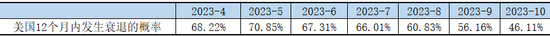 具体来说,在今年5月份的时候,美国长短利差信号给出来的美国经济衰退概率是70.85%,到了10月份长短利差倒挂幅度显著缩窄之后,美国经济衰退的概率下降到46.1%,这个是一个很重要的变化。