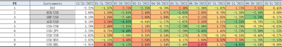 第二个我们看一下汇率,因为我们前面提过美元指数在10月份的时候最高上涨到107.35,在这个过程中,其他的货币对美元的汇率都出现了不同幅度的贬值,甚至包括在去年美联储加息缩表过程中表现非常强势的墨西哥比索、巴西雷亚尔等,这些货币在今年也出现了下跌,这是汇率方面。