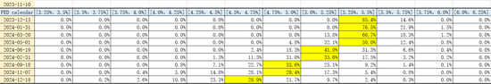第二点,目前市场的预期是什么样子的?我们可以简单的介绍一下目前市场对美联储是否继续加息的预期,12月美联储会议加息的概率非常低,大概只有10%左右,明年1月,市场预计美联储再加25个基点的概率有30%左右,30%这个概率不高,但是又不能忽略它。