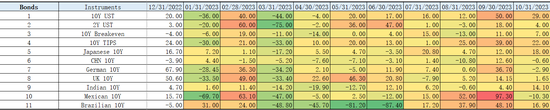 今年美债收益率的这种变化趋势和去年是形成鲜明对比的。去年我们还记得美联储加息缩表这个过程中,美债收益率整体是呈上升趋势的,但是随着美国通胀见顶回落,美联储在2022年年底的时候放缓了加息的步伐,在11月份(2022年11月份)前后,美债收益率也从上涨转为下跌。