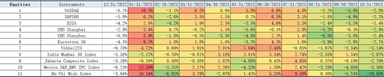 最后一个,主要的股票市场,我们看行情数据,会发现在美债收益率上涨、美股下跌的过程中,主要的股市都跟随下跌。这其中包括上半年表现不错的日本股市、印度股市、墨西哥股市、越南股市,下半年也都出现了下跌。