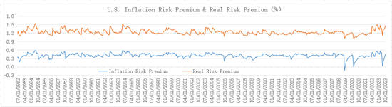 由于期限溢价在上涨,通胀风险溢价在上涨,使整体的美债风险溢价也在上涨,10月份的时候整体风险溢价上涨到1.46%,比6月份上涨了35个基点,这是一个非常重要的因素,影响美债收益率上涨的重要因素。
