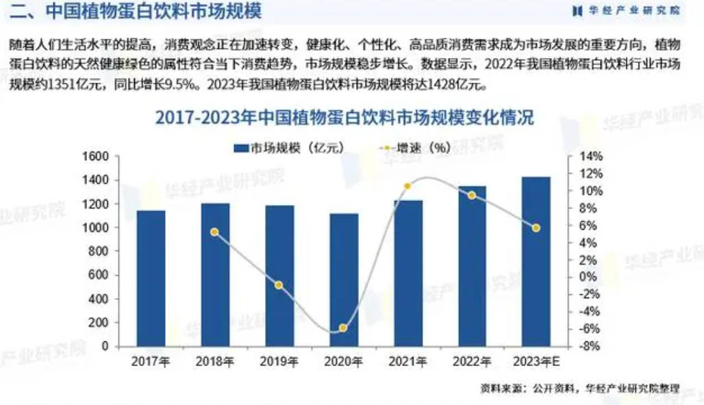 从市场角度来说,“植物基”在中国市场,乃至全球市场,仍有广阔的发展空间。据华经产业研究院发布的《2023-2028年中国植物蛋白饮料行业发展前景预测及投资战略规划研究报告》显示,植物蛋白奶在我国有着广阔的市场前景,未来几年植物奶行业仍将保持较高增速,预计2025年植物奶市场规模将超1428亿元。