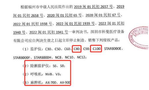 迈瑞医疗的《侵权告知函》里,列出的8个一审判决书中,有2例被最高院驳回。其中涉及的18款产品,有10款监护仪产品被最高院判决科曼进行赔偿,但呼吸机、麻醉机等产品的专利案件被最高院驳回起诉。