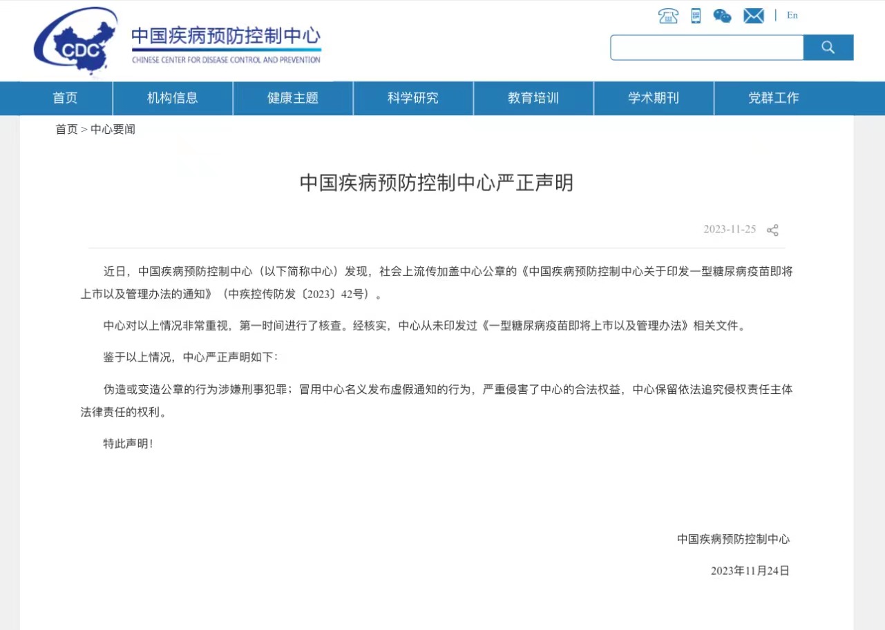 上证报中国证券网讯 中国疾病预防控制中心11月25日发布声明称,近日,中国疾病预防控制中心(以下简称中心)发现,社会上流传加盖中心公章的《中国疾病预防控制中心关于印发一型糖尿病疫苗即将上市以及管理办法的通知》(中疾控传防发〔2023〕42号)。