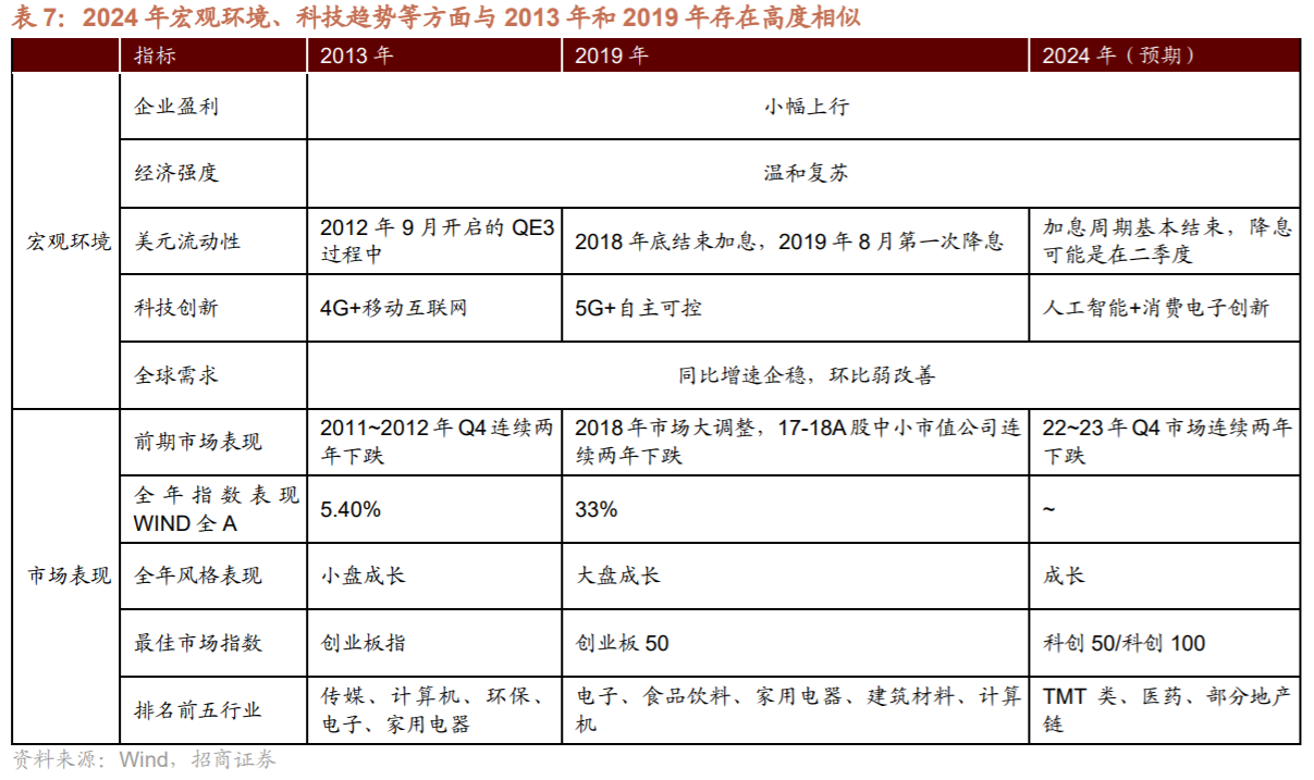 复盘来看,张夏等人认为2024年宏观环境和科技趋势,与2013和2019年有高度相似的特征,因此行业选择的思路也高度相似。另外2023年是科技创新周期、地产弱复苏、弱稳增长,因此市场选择的行业是TMT、家电建材类。
