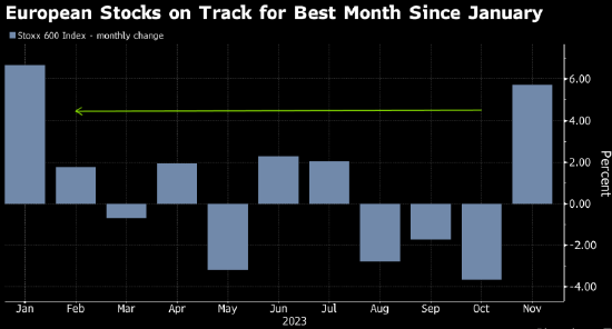 欧洲股市目前位于两个月高位,主要股指势将创下1月份以来的最佳单月表现。对通胀放缓将允许央行偏向鸽派的预期提振了市场信心。