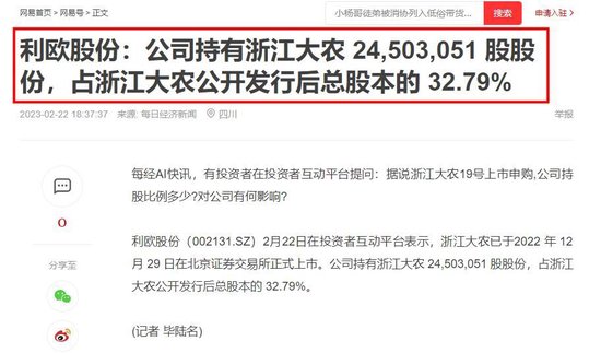 利欧 股份(002131)于今年2月22日在投资者互动平台表示,浙江 大农(831855)已于2022 年 12 月 29 日在北京证券交易所正式上市。公司持有浙江 大农(831855)24,503,051 股股份,占浙江 大农(831855)公开发行后总股本的 32.79%。据此测算,本周浙江 大农(831855)的股价经过大涨33.88%之后,截止本周五收盘,利欧 股份(002131)所持有的浙江 大农(831855)32.79%股权,在这一周之内增值了5488.68万元。