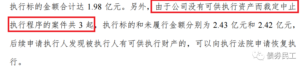 而另一方面,部分城投公司已经走到了危险的边缘。比如某城投公司“由于公司没有可供执行资产而裁定终止执行程序的案件共3起”。那也就是说,这个城投公司已经没有可供执行的银行存款、应收账款建筑物或者土地等能够变现的资产了。这个公告中披露的信息,真的是让人有种沉重的无力感,让人无可奈何的感慨。