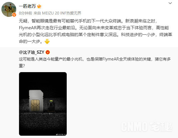 魅族科技助理副总裁@一匹老万 表示,无疑,智能眼镜是最有可能替代手机的下一代大众终端。新浪潮来临之时,Flyme AR再次走在行业最前沿。据悉,Flyme AR搭载了“可能是人类迄今能量产的最小光机,也是保障Flyme AR全天候体验的关键”。