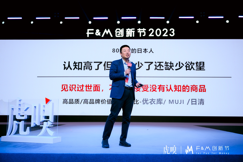 在半个小时的演讲中,这位全程脱稿却拥有其他演讲者两倍乃至三倍语速的企业家,激情满满地阐释了他对于品牌如何逆势增长的理解,并配合了大量案例。在他看来,像上世纪80年代日清豚骨拉面、优衣库这样主打品质和性价比品牌在日本的成功,恰恰说明了消费者在市场低迷期的价值偏好。