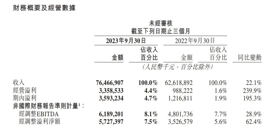 Q3营收764.67亿元(人民币,下同),同比增长22.1%;