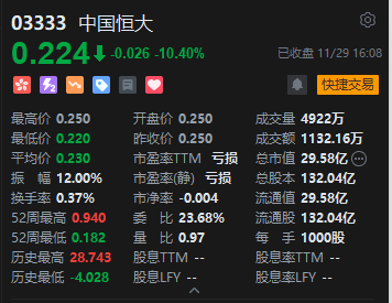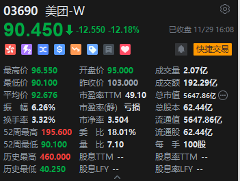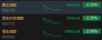 11月29日消息,港股三大指数高开低走,截至收盘,恒生指数跌2.08%,报16993.44点,恒生科技指数跌2.25%,国企指数跌2.32%。盘面上,核心科技股普遍下跌,美团跌超12%领衔,百度集团跌超4%;阿里巴巴跌超2%,京东集团跌超1%,内房股普跌,中国恒大跌超10%领衔;汽车股跌幅明显,雅迪控股跌超5%,理想汽车跌超3%;中资券商股表现萎靡,广发证券跌超6%;国际金价冲上2050大关,黄金股逆势走强,招金矿业涨超5%;濠赌、互联网医疗、餐饮等板块跌幅靠前。
