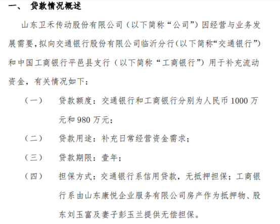 挖贝网11月29日,卫禾传动 近日发布公告,山东卫禾传动股份有限公司(以下简称“公司”)因经营与业务发展需要,拟向交通银行股份有限公司临沂分行(以下简称“交通银行”)和中国工商银行平邑县支行(以下简称“工商银行”)用于补充流动资金,有关情况如下: