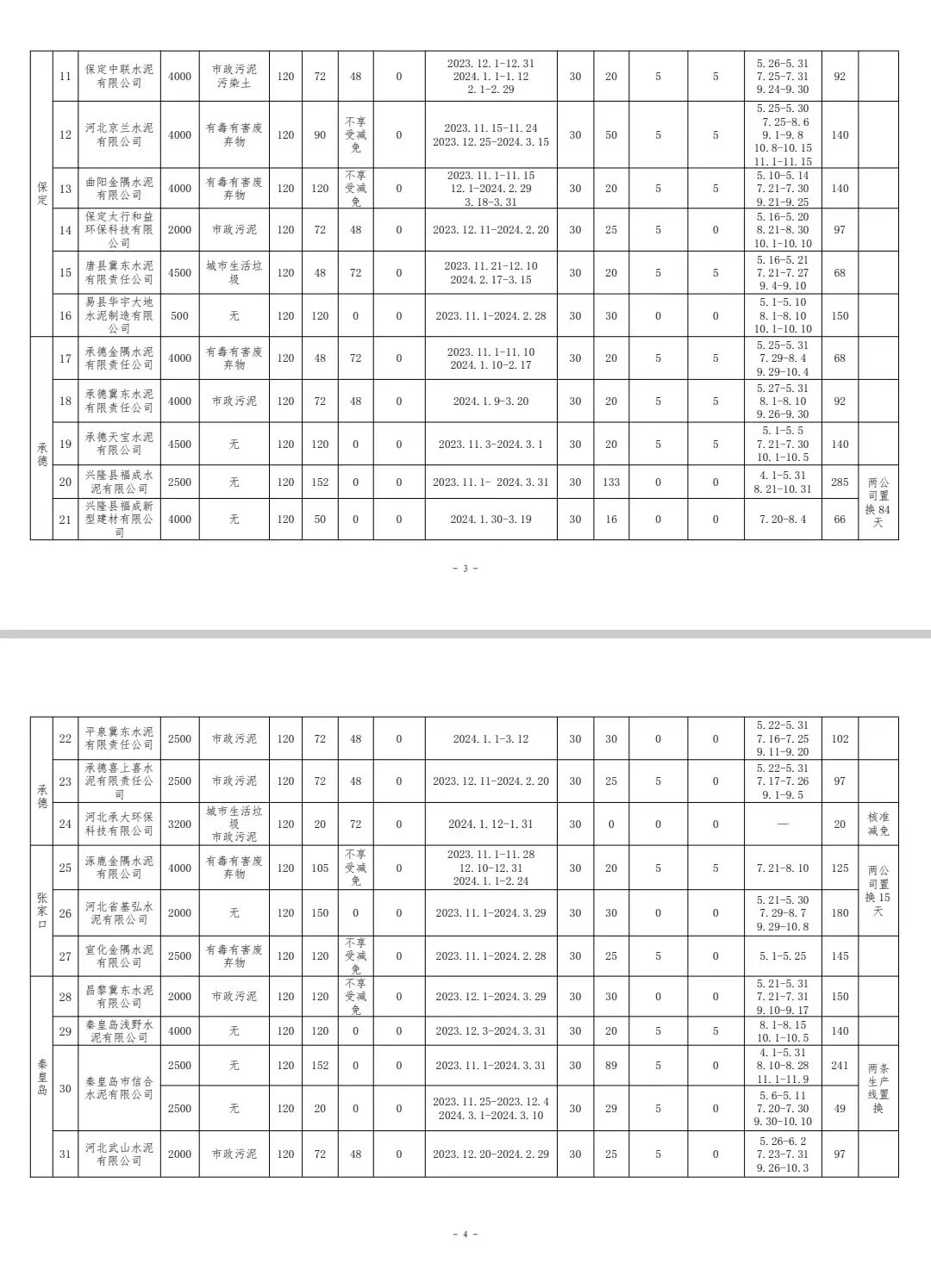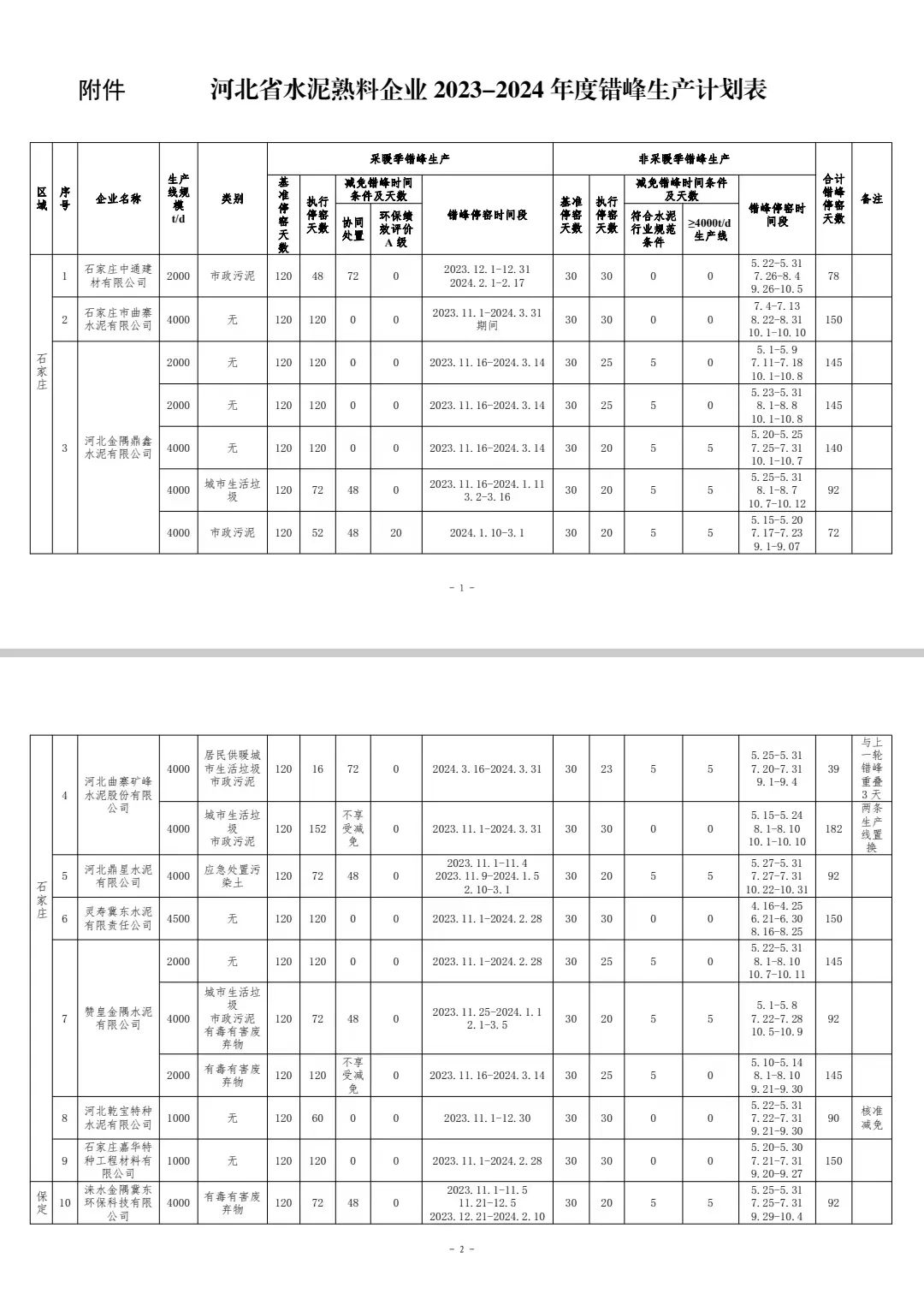 近日,河北省建筑材料工业协会公布河北省水泥熟料企业2023-2024年度错峰生产计划明细。其中,协同处置、环保绩效A级等都有天数减免。