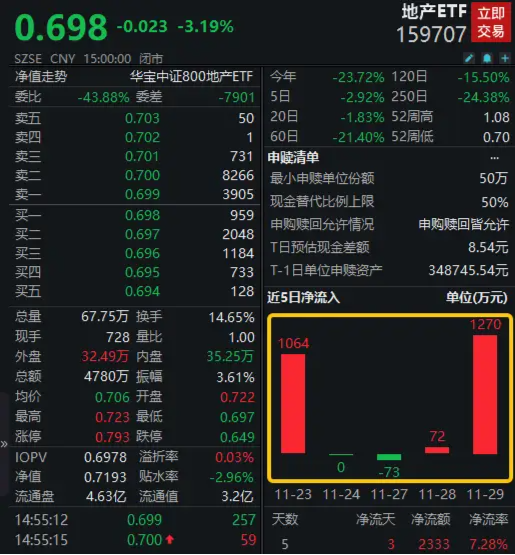 另外,值得注意的是,在板块大幅调整之际,资金却跑步进场,抢筹相关地产ETF,也从侧面说明资金或仍高看地产一线。例如,地产ETF(159707)单日获资金净流入1270万元,基金份额稳步攀升。时间拉长来看,地产ETF(159707)近5日有3日获资金净流入,合计金额超2300万元!