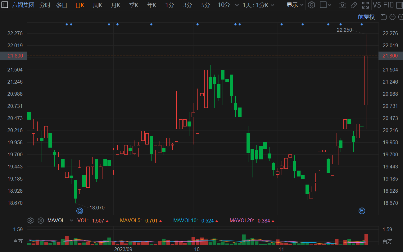 六福集团(0590.HK)现超7%,高见22.25港元创阶段高价,成交额放大至3314万港元,总市值128亿港元。公司截至今年9月底止中期纯利9.43亿元,同比增长43.3%,创历年同期第二高;每股盈利1.61元。派中期息72仙,上年同期派55仙。