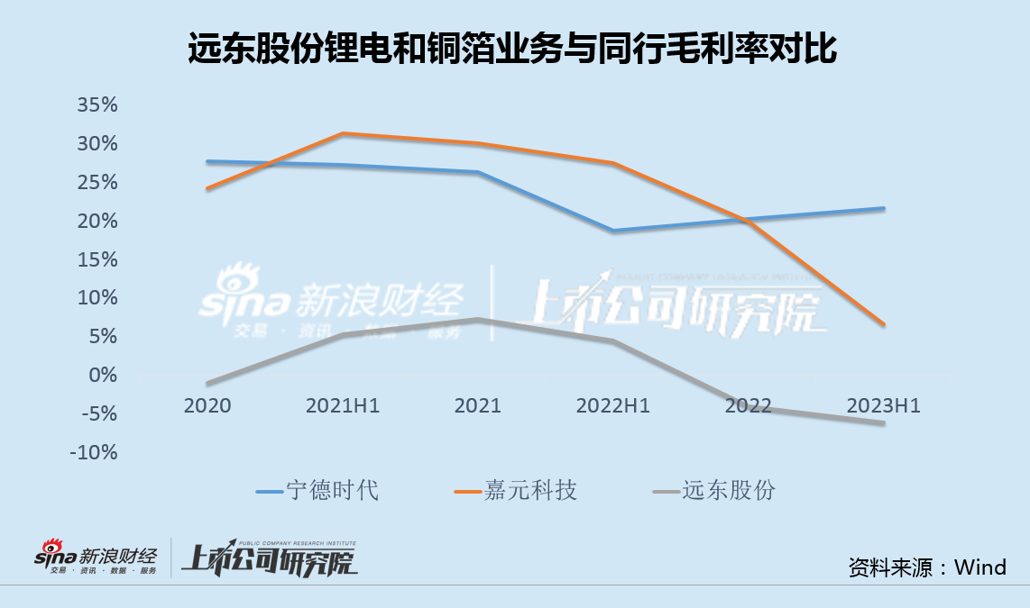 数据显示,远东股份近几年智能电池业务毛利率持续在0附近徘徊,2022年和今年上半年已降为负值,远低于宁德时代和锂电铜箔企业嘉元科技等上市公司的同期水平。