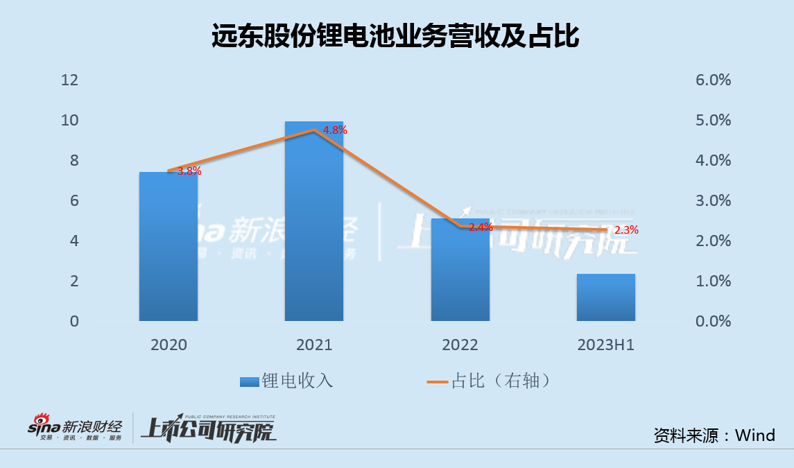 统计显示,2020年至2023年上半年,远东股份智能电池(锂电池和铜箔)业务收入分别为7.4亿、10.0亿、5.1亿和2.4亿元,仅占公司同期总营收比例分别为3.8%、4.8%、2.4%和2.3%,增速和占比均呈下滑趋势。
