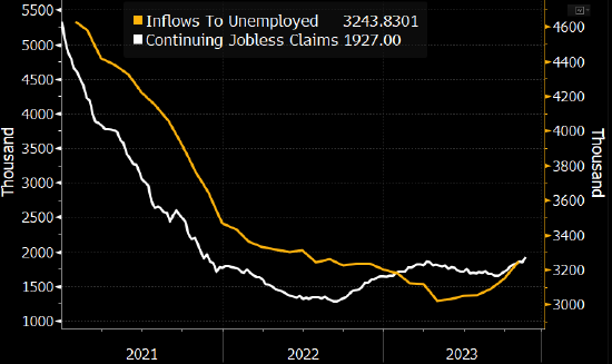 从11月和10月非农就业报告的调查周来看,持续申领失业救济人数增加了14.4万人——增幅甚至高于前一个月的11.8万人,当时失业率飙升至3.9%。持续申领失业救济人数的持续攀升表明11月失业率有可能升至4.0%。
