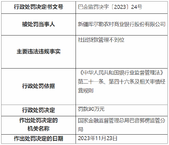 12月1日金融一线消息,国家金融监督管理总局巴音郭楞监管分局行政处罚信息公开表显示,新疆库尔勒农村商业银行股份有限公司因社团贷款管理不到位,被国家金融监督管理总局巴音郭楞监管分局罚款30万元;张晓龙时任新疆库尔勒农村商业银行股份有限公司公司银行部总经理,对新疆库尔勒农村商业银行股份有限公司社团贷款管理不到位负有责任,被警告并处罚款6万元。