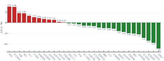 申万一级行业中,煤炭涨幅最大为3.04%,房地产板块跌幅最大为4.89%。受近期煤炭行业供给扰动影响,本周煤炭行业涨幅较大。