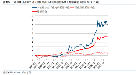 根据自上而下,结合宏观、量化基本面、财务因子、分析师预期、机构偏好、量价技术和资金流等维度,我们构建的六维度综合行业配置模型样本外超额年化10%,2023年以来超额收益录得6.4%。