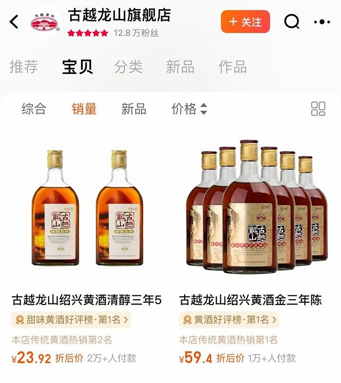 从其旗舰店销量来看,公司卖的最好的一款是绍兴黄酒清醇三年,月售2万+,折后不到24元的价格可以买到500ml两瓶,约合12元一瓶。