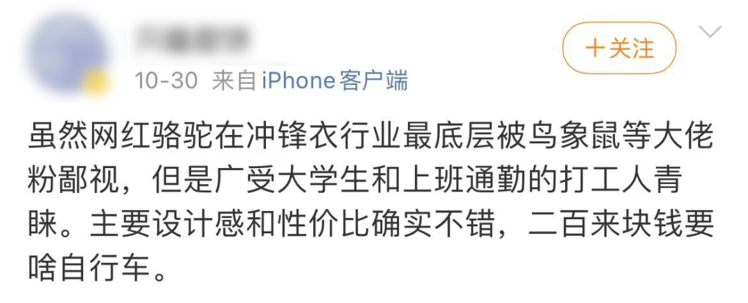 在相关评价中,许多人称以骆驼为代表的国货冲锋衣为“始祖鸟平替”“加拿大鹅平替”。