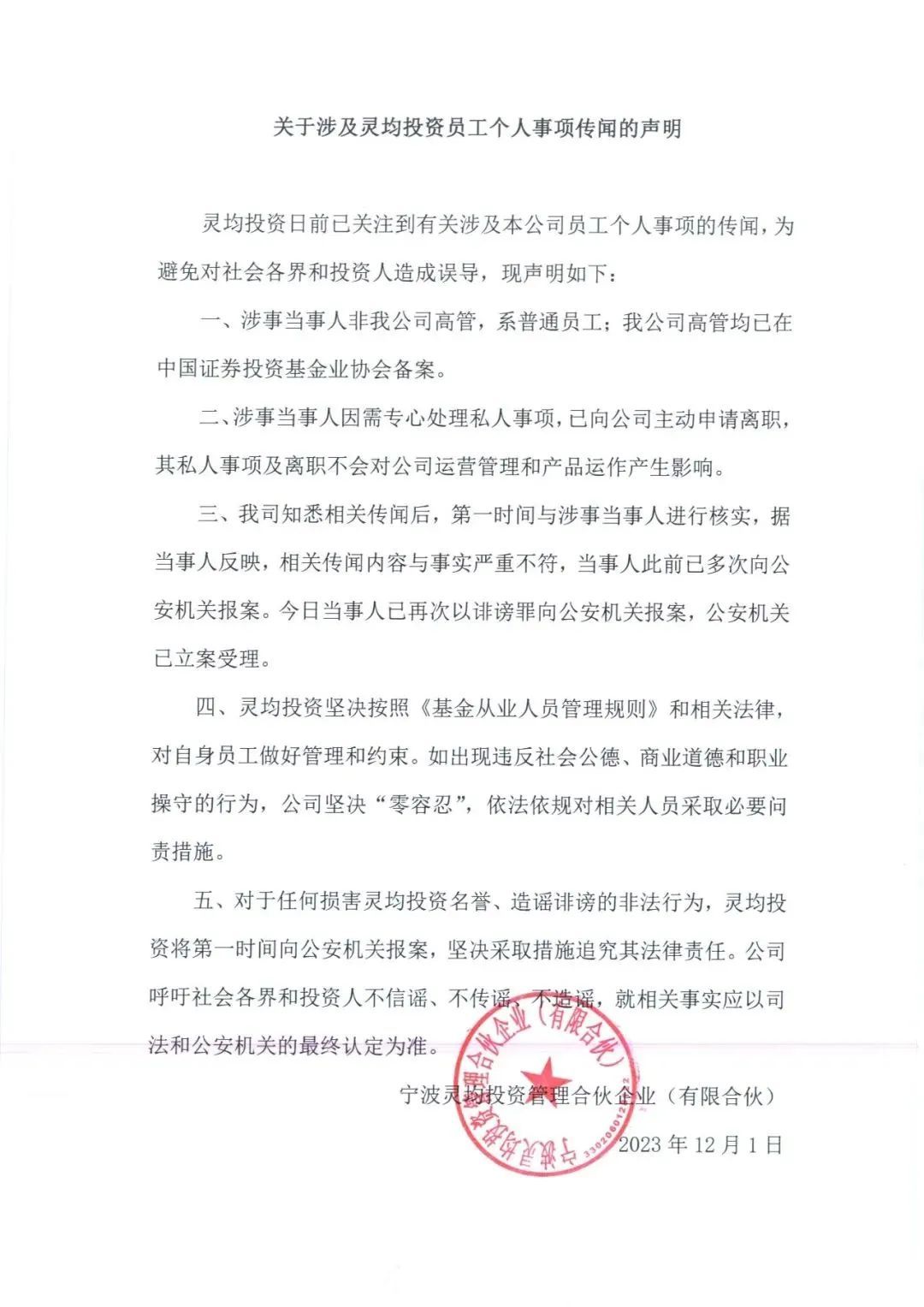 12月1日晚,灵均投资发布声明称,涉事当事人非该公司高管,系普通员工;该公司高管均已在中国证券投资基金业协会备案。目前涉事当事人因需专心处理私人事项,已向公司主动申请离职,其私人事项及离职不会对公司运营管理和产品运作产生影响。