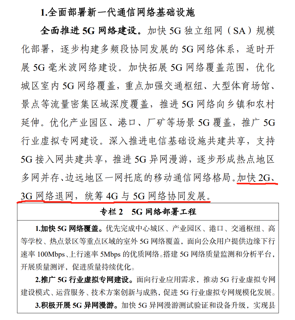 2021年11月,工信部印发的《“十四五”信息通信行业发展规划》明确提出,加快2G、3G网络退网,统筹4G与5G网络协同发展,将2G、3G退网列入“十四五”期间网络基础设施建设的重点工作。