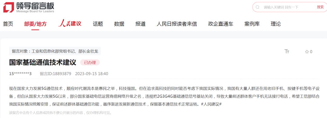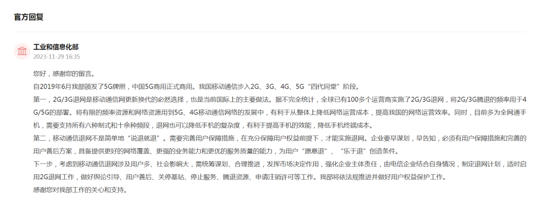 据领导留言板,近日,工信部在领导留言板就用户关心的2G/3G退网相关问题进行了回复。