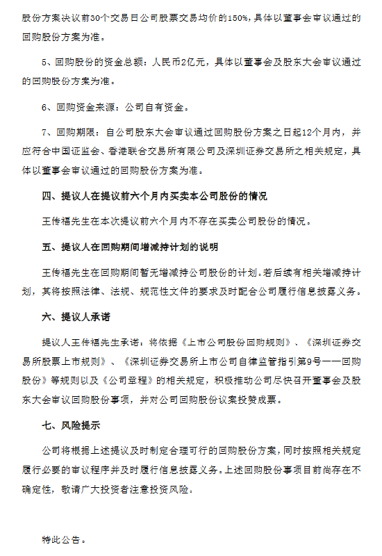 比亚迪公告,实际控制人、董事长兼总裁王传福提议以2亿元回购公司股份,回购价格上限不高于公司董事会审议通过回购股份方案决议前30个交易日公司股票交易均价的150%,具体以董事会审议通过的回购股份方案为准。