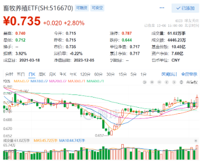 截至收盘,畜牧养殖ETF(516670)涨2.80%,报收0.735元,连续收复5日、20日、120日等多道重要均线,盘中成交额4446万元,成交额创10月31日以来新高。