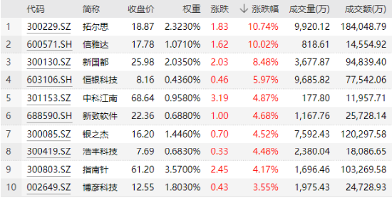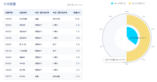 资料显示,金融科技ETF(159851)被动跟踪中证金融科技主题指数,第一大权重行业为计算机,占比约80%,覆盖了数字经济、ChatGPT、信创、金融IT等热门主题。其第二大权重行业为非银金融,占比近14%,成份股主要为互联网券商。附前十大权重股一览: