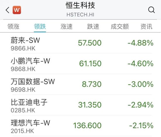 港股方面,三大指数走弱,造车新势力跌幅居前,蔚来、小鹏汽车跌超4%,理想汽车跌超2%。